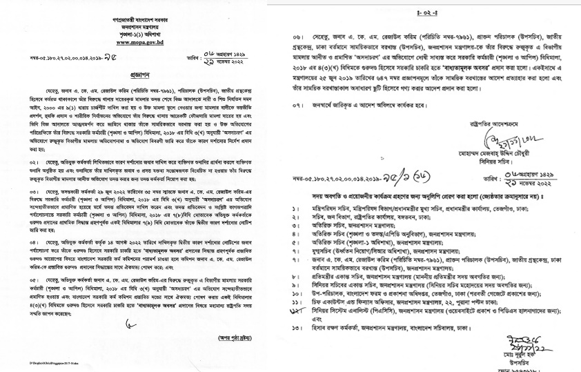 এতে আরও বলা হয়, উপসচিবের দেওয়া জবাব সন্তোষজনক না হওয়ায় অভিযোগ তদন্তে করার জন্য তদন্ত কর্মকর্তা নিয়োগ করা হয়। তদন্তে অভিযোগ সন্দেহাতীতভাবে প্রমাণিত হয়েছে মর্মে প্রতিবেদন দাখিল হয়। তদন্ত প্রতিবেদন ও সংশ্লিষ্ট কাগজপত্রাদি পর্যালোচনা করে শৃঙ্খলা ও আপিল বিধিমালা অনুযায়ী রেজাউল করিমকে গুরুদণ্ড দেওয়ার প্রাথমিক ও চূড়ান্ত সিদ্ধান্ত হয়।