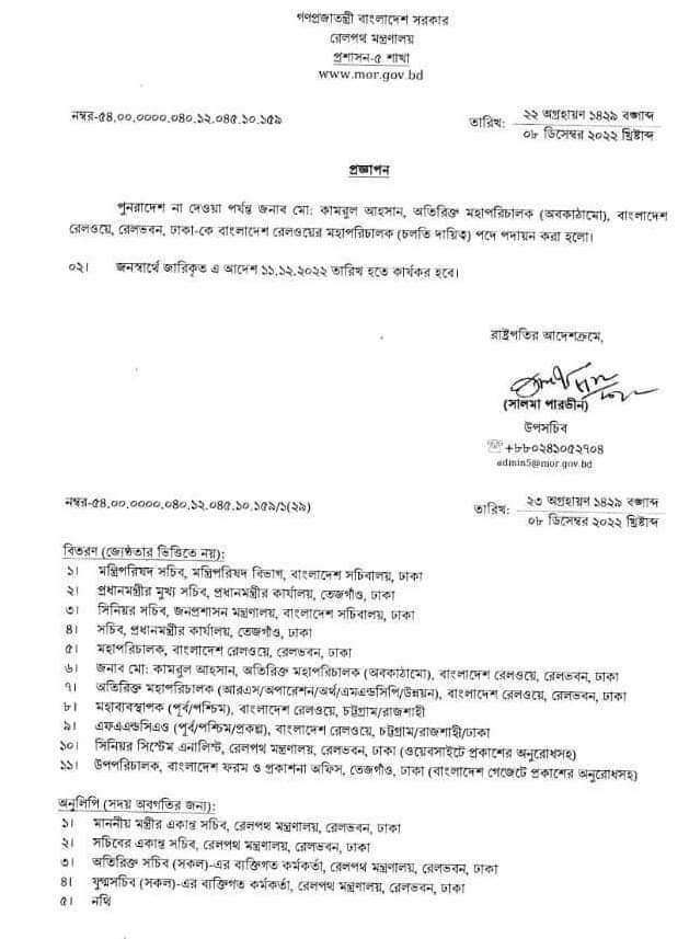 রেল বিভাগের উপসচিব সালমা পারভীন স্বাক্ষরিত ওই প্রজ্ঞাপনে বলা হয়, পরবর্তী আদেশ না দেওয়া পর্যন্ত মো. কামরুল আহসান রেলওয়ের অতিরিক্ত মহাপরিচালককে (অবকাঠামো) বাংলাদেশ রেলওয়ের মহাপরিচালক পদে পদায়ন করা হলো।